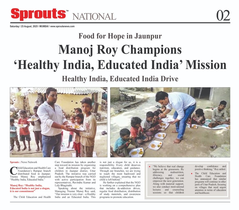 फाउंडेशन के मैनेजिंग ट्रस्टी मनोज राय ने बताया कि “स्वस्थ भारत, शिक्षित भारत” संगठन का प्रमुख मिशन है। उन्होंने कहा कि एनजीओ की योजना अति पिछड़े गांवों को चिन्हित कर वहां समय-समय पर नशा मुक्ति अभियान, भोजन वितरण, शिक्षण सामग्री वितरण तथा शिक्षा के प्रचार-प्रसार से जुड़े कार्यक्रम आयोजित करने की है।